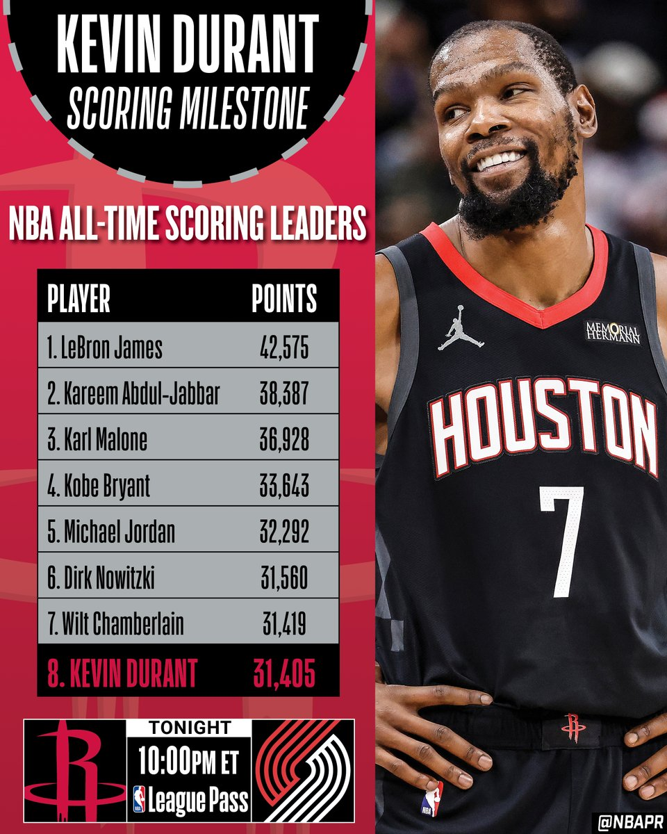 上个月,杜兰特成为联盟第八位生涯总得分突破31000分的球员,当时他坦言,能够与詹姆斯、贾巴尔、卡尔-马龙、科比、乔丹、诺维茨基和张伯伦这些名宿并肩,对他意义重大。