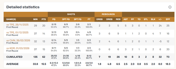 这四场比赛渡边场均33.8分钟,拿到15.5分6.5篮板2.5助攻0.5抢断2盖帽,命中率47.2%,三分命中率22.2%,作为日本核心球星他这个数据其实非常一般,要知道韩国核心锋线李贤重场均24.3分,三分命中率高达45%
